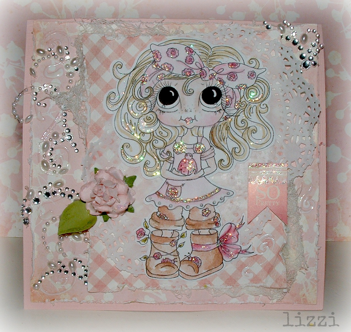 Hi and very happy to be here with the new challenge at scrapbook stamp society...this time it's anything goes with some swirls...i have used some beautiful papers from vintage marketplace..i just love love love these....my image is just tooo sweet...she's holding a lady bug...this just begged me to all pinkify her...so i did..i added pearl and rhinestone swirls a little glitter paing and some enamel....